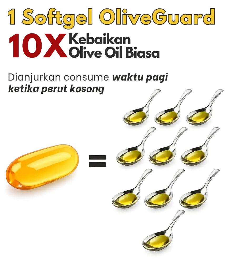 Olive Guard+ formulasi lebih likat berbanding dari olive oil biasa dan juga ada campuran sains iaitu seabuckthorn & tocotrienols . Amalkan 1 softgel Olive Guard setiap pagi sebelum sarapan.